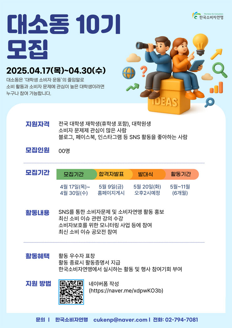한국소비자연맹 2025년 대소동10기(대학생 홍보단) 모집