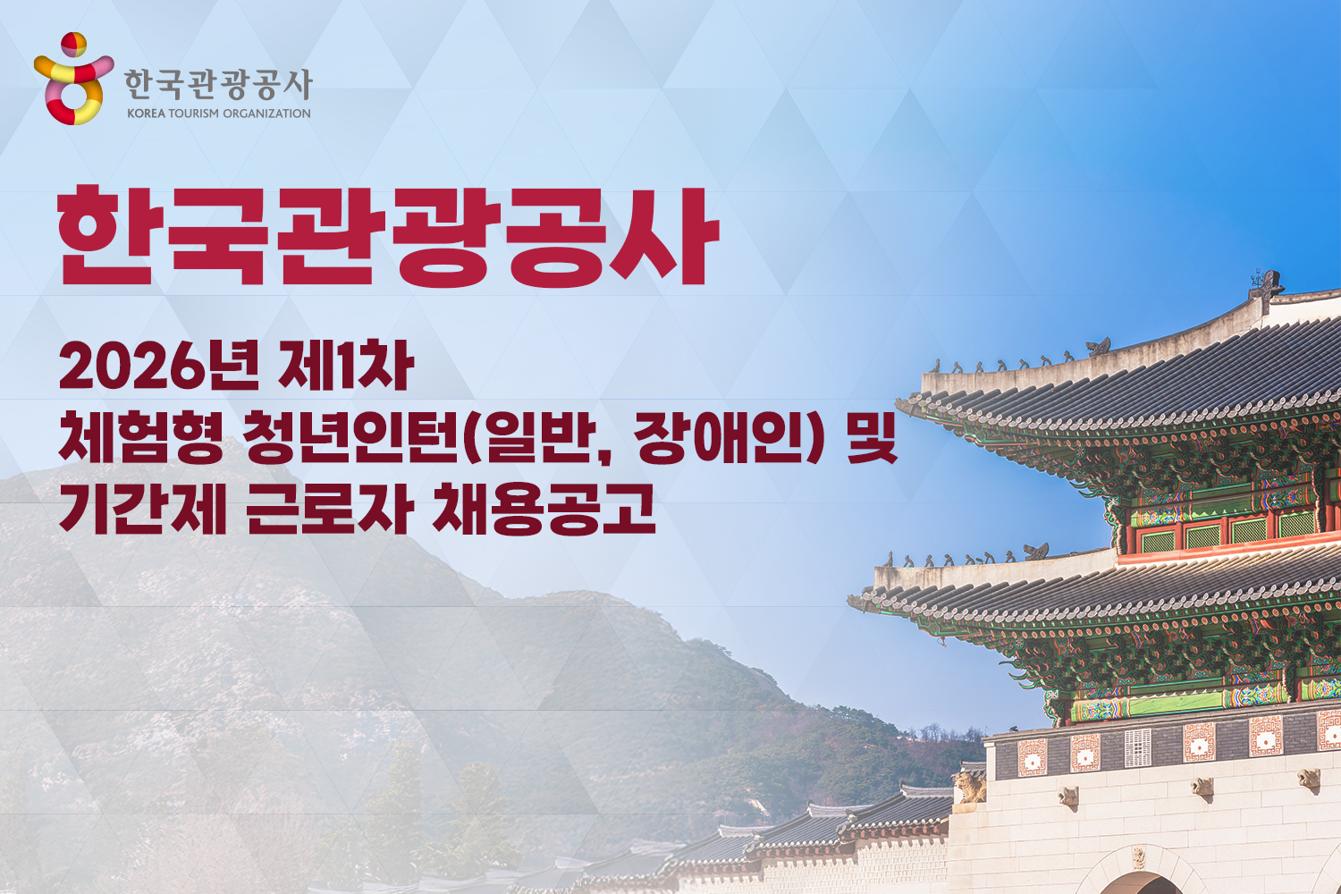 □ 채용형태: 체험형 청년인턴, 기간제 근로자 (계약기간 만료 후 고용관계 소멸) □ 모집부문 등 근무장소 인원(명) 비고(소속부서 등) 체험형 청년인턴 본사 본사(원주) 12 채용 후 부서배치 예정 고졸인재 세종충북지사(청주) 1 대전충남지사(대전) 1 전북지사(전주) 1 제주지사(서귀포) 1 체험형 청년인턴 (장애인) 재택 및 본사(원주) 12 희망자 수요 등 고려 부서배치 예정 기간제 사무보조 본사(원주) 1 본사 평가분석팀 지사행정 전북지사(전주) 1 전북지사 ※ 모집부문 간 중복 지원 불가(중복 지원 사실 확인 시 지원한 모든 부문 불합격 처리) ※ 부문별 지원인원 미달 또는 전형결과 적격자가 없을 경우 최종합격자를 선발하지 않거나, 채용 예정 인원보다 적게 선발할 수 있음 □ 근무조건 모집부문 계약기간 기본급(월) 비고 체험형 일반 ’26. 1. 15.~’26. 7. 14. 2,115,080원 ㅇ (근무시간) ㅇ (부여직무) ㅇ (근무혜택) 계약기간 근무 완료 시 수료증 발급 및 신입사원 채용 시 가점 부여 장애인 ’26. 1. 1.~’26. 6. 30. 1,062,600원 기간제 근로자 사무보조 ’26. 1. 1.~’26. 4. 30. 2,115,080원 ㅇ (근무시간) 1일 8시간, 주 5일 근무 ㅇ (담당업무) 지사행정 ’26. 1. 19.~’26. 12. 31. 2,115,080원 ㅇ (근무시간) 1일 8시간, 주 5일 근무 ㅇ (담당업무) ※ 월 기본급은 ’25년 한국관광공사 계약직 근로자 임금 기준이며, 추후 임금인상률 등을 반영한 ’26년 한국관광공사 계약직 근로자 임금 확정 시 변경 적용 예정 □ 주요업무: 직무기술서 참조(붙임1) □ 청년인턴 수료자 우대사항 1. 청년인턴 □ 공통 지원자격 ※ 모집부문에 관계없이 필수 충족 필요 ㅇ 「청년고용촉진 특별법 시행령」 제2조에 따른 청년 연령으로서, 입사예정일 기준 15세 이상 34세 이하인 자 □ 모집부문별 지원자격 [일반(본사)] 부문 ▪ 600점 이상의 TOEIC 성적 보유자 [일반(고졸인재)] 부문 아래 요건에 모두 해당하는 자 [장애인] 부문 ▪ 「장애인고용촉진 및 직업재활법」에 의거한 장애인 ※ 외국어 점수 인정 요건: 입사지원서 접수 마감일 마감시각까지 공식적으로 발표되고, 입사예정일 기준 유효기간(2년)이 지나지 않은, ▪ 단, 별도의 유효기간이 없는 시험일 경우 응시일로부터 2년이 지나도 인정하며, 유효기간 만료 전 인사혁신처 통합채용포털(career.gosi.kr)에 유효한 성적으로 등록된 경우 ▪ 국내 시험 주관처의 공식적인 조회 및 진위여부 확인이 불가한 국외 응시 성적, 특별시험 성적 등은 인정하지 않음 ※ 지원자격은 본 공고에 명시된 기준에 따른 증빙서류로 증명 가능한 경우에 한하여 인정함 □ 채용제외대상자 ※ 채용제외대상자 요건 중 하나 이상 해당하는 사람은 지원할 수 없으며, 합격된 이후에도 합격 취소 또는 즉시 계약해지 될 수 있음 ㅇ 한국관광공사 청년인턴 근무경험이 있는 자 2. 기간제 근로자 □ 공통 지원자격 ㅇ 입사예정일 기준 공사 정년(만 60세) 미만인 자 □ 채용제외대상자 ※ 채용제외대상자 요건에 해당하는 사람은 지원할 수 없으며, 합격된 이후에도 합격 취소 또는 즉시 계약해지 될 수 있음 ㅇ 공사 인사규정상 결격사유에 해당되는 자 또는 채용시행세칙 등에 의거한 부정행위자 ([붙임2] 참조) 1. 청년인턴 | ||||||||||||||||||||||||||||||||||||||||||||||||||||||||||||||||||||
